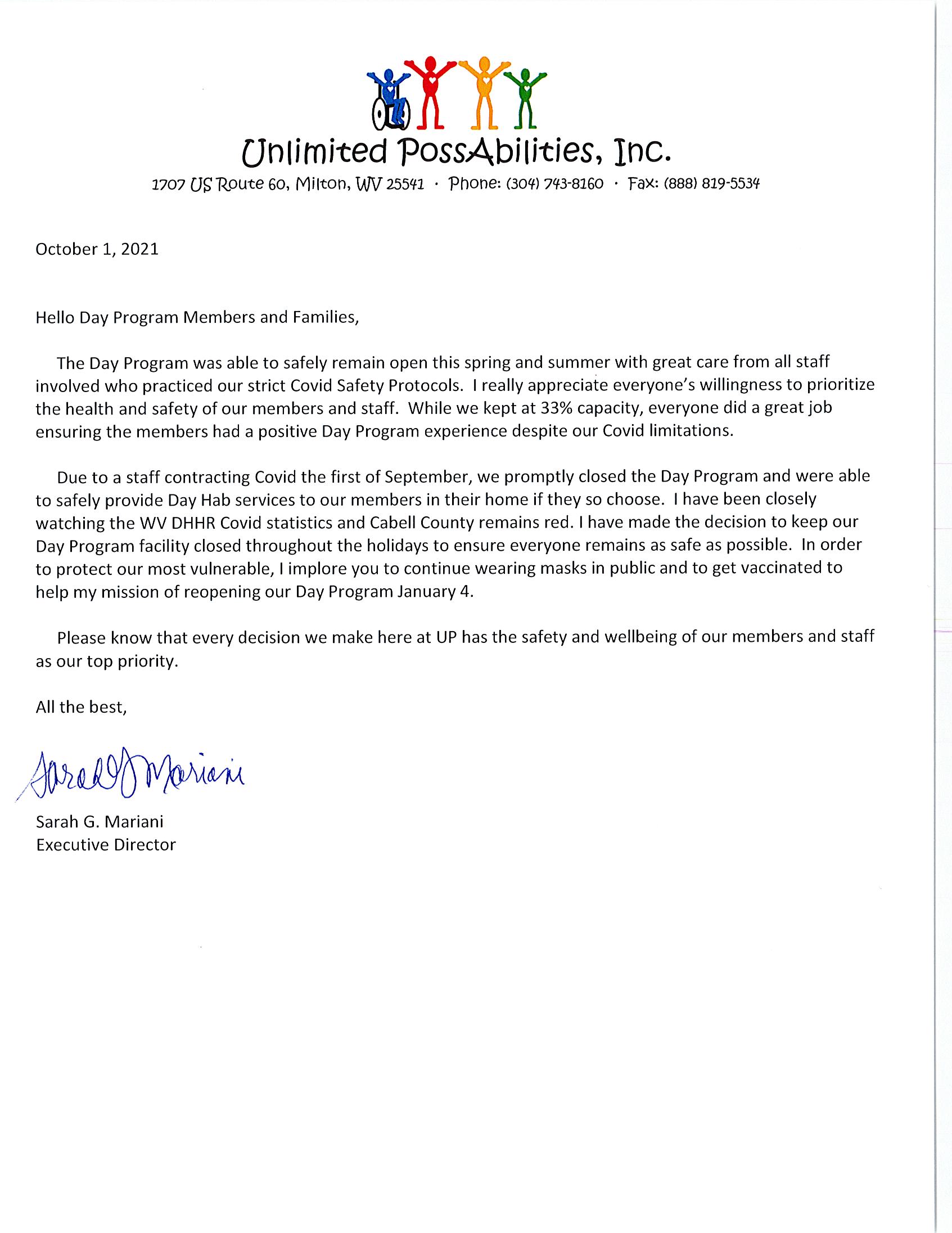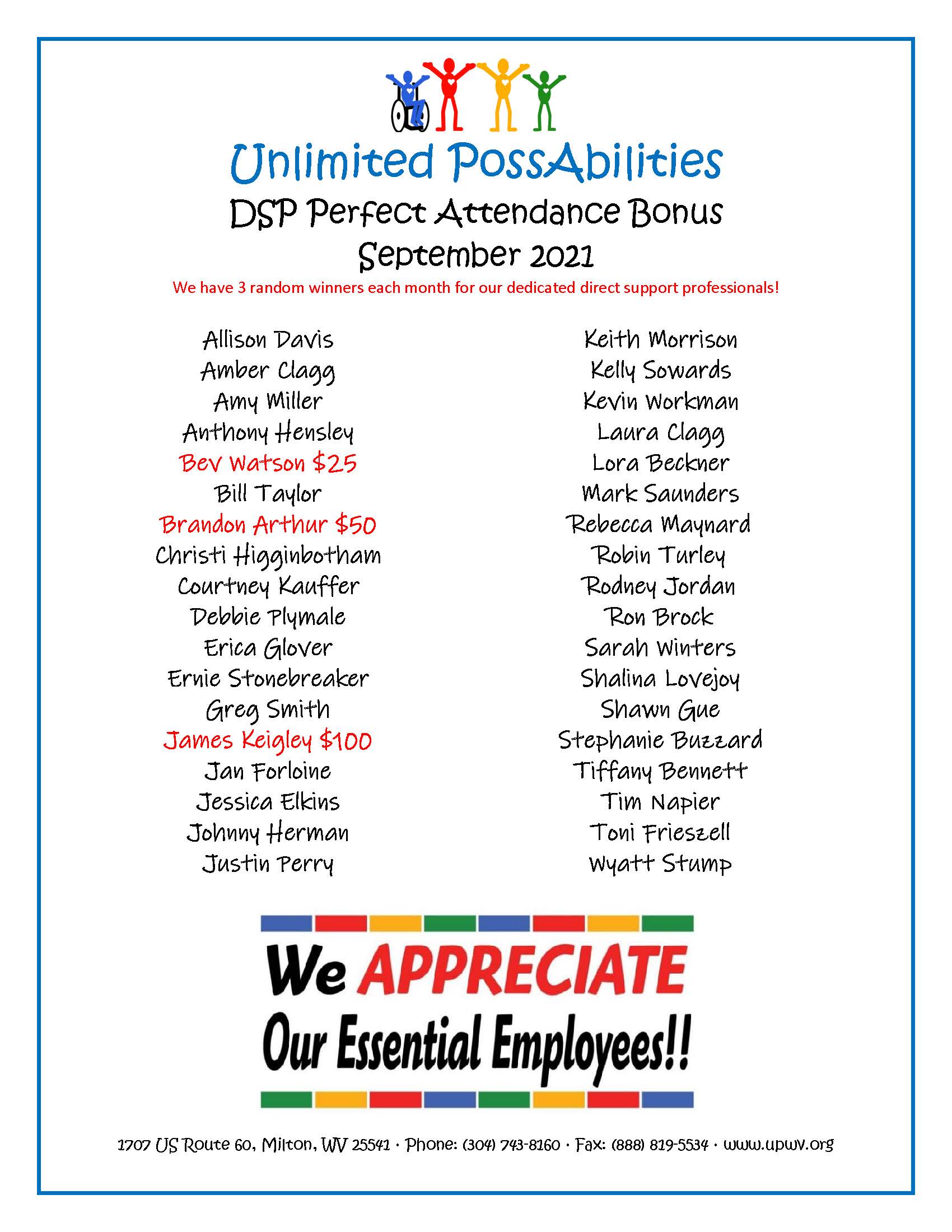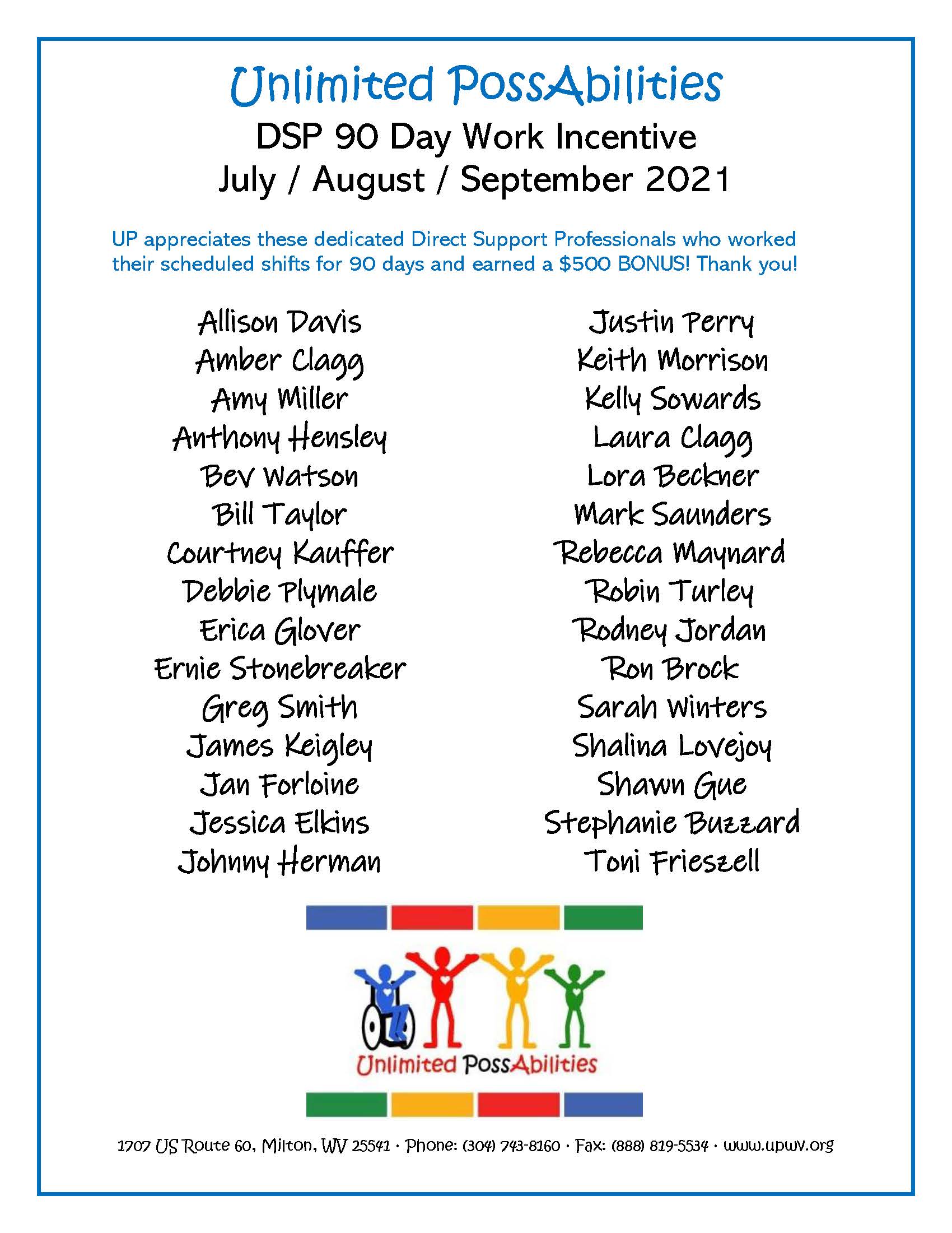 Unlimited PossAbilities, Inc. (UP) is a Title XIX Intellectual/Developmental Disability Waiver Agency and Day Program located in Milton, WV. We offer competitive wages and a positive working environment. UP is dedicated to providing individuals and their families with efficient services that enhance quality of life and facilitate opportunities to grow. UP encourages each individual and family to believe and learn that goals are obtainable because with us by your side, there are unlimited possibilities!